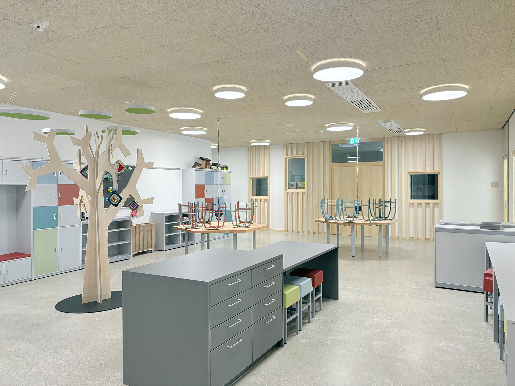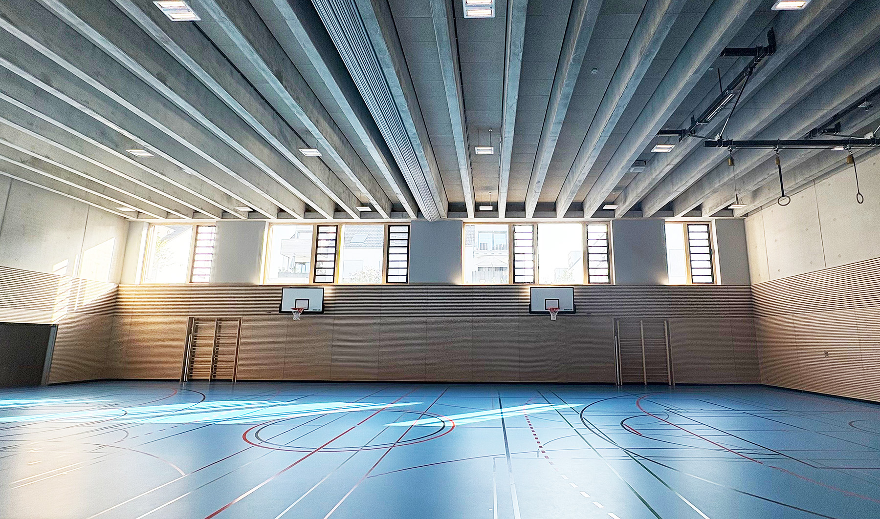 Zweifeldsporthalle, Dusch- und Umkleideräume im UG, Grundschule im EG und OG, Foyer mit Speisebereich, Küche, Technikzentralen, PV-Anlage mit 104 kW als Gründachsystem.