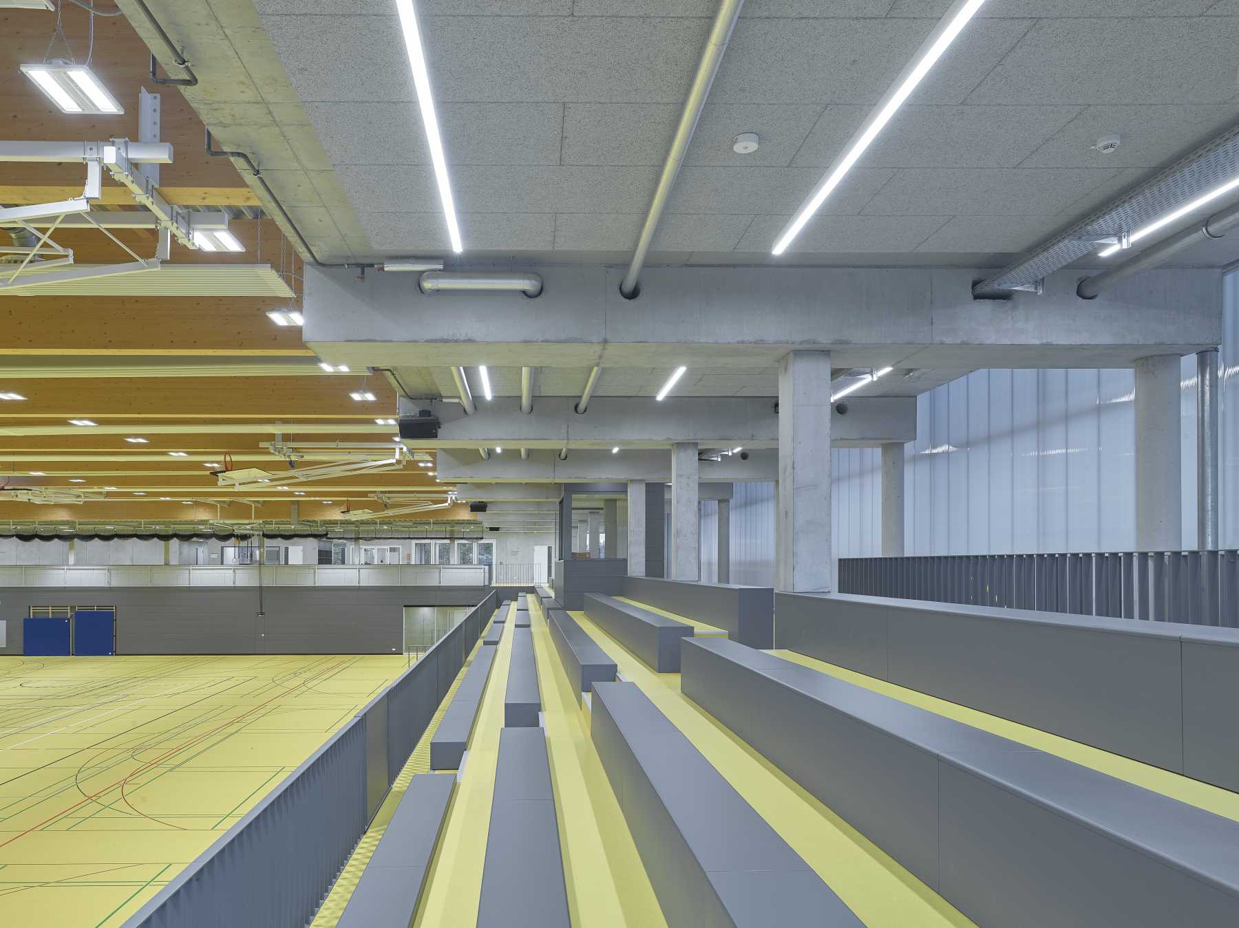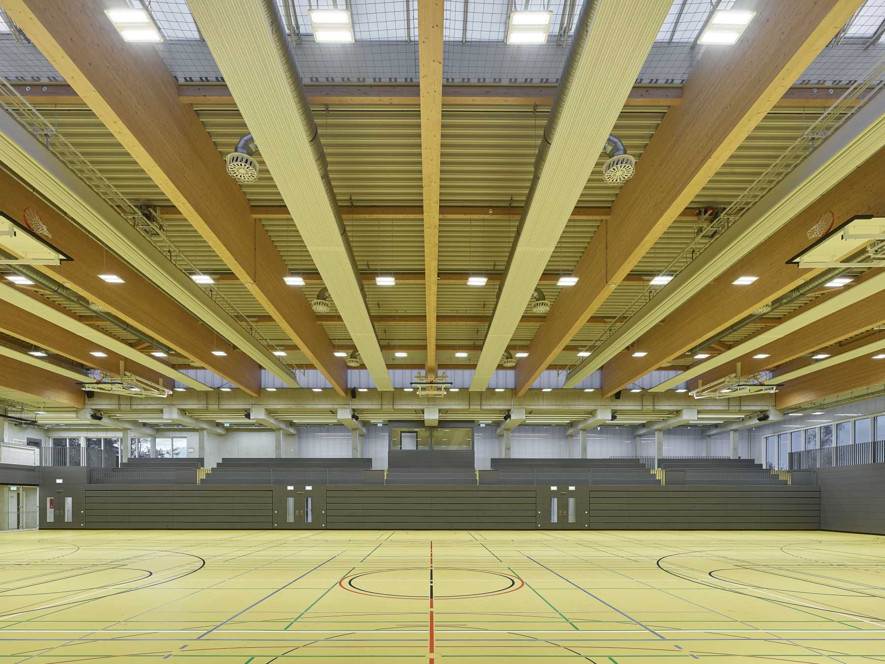 Dreifeldsporthalle mit Zuschauertribüne für 950 Personen, Dusch- und Umkleideräume in der Ebene 0, Multifunktionsraum für Schul- und Vereinssport in der Ebene 1 dient bei Handballspielen als VIP-Raum, Küchentrakt sowie zweite Theke auf der Ebene 1, Technikzentralen in der Ebene 0, PV-Anlage als Gründachsystem zur CO2-Neutralität (Errichtet durch Bürgerenergie)